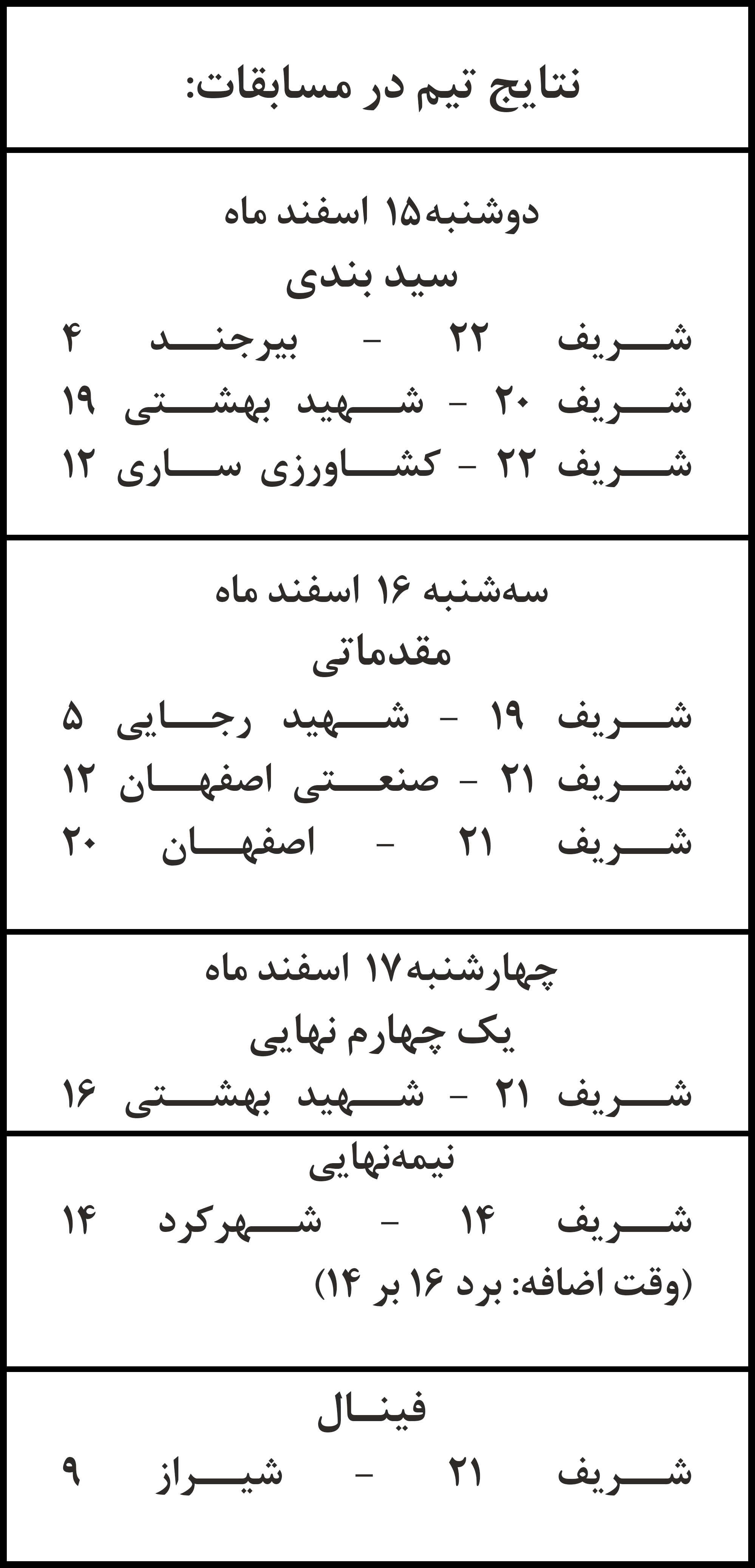 در این مسابقات بسکتبالیستهای دانشگاه صنعتی شریف با اقتدار و شکست تمامی رقیبان، بر سکوی قهرمانی رقابتها ایستادند.